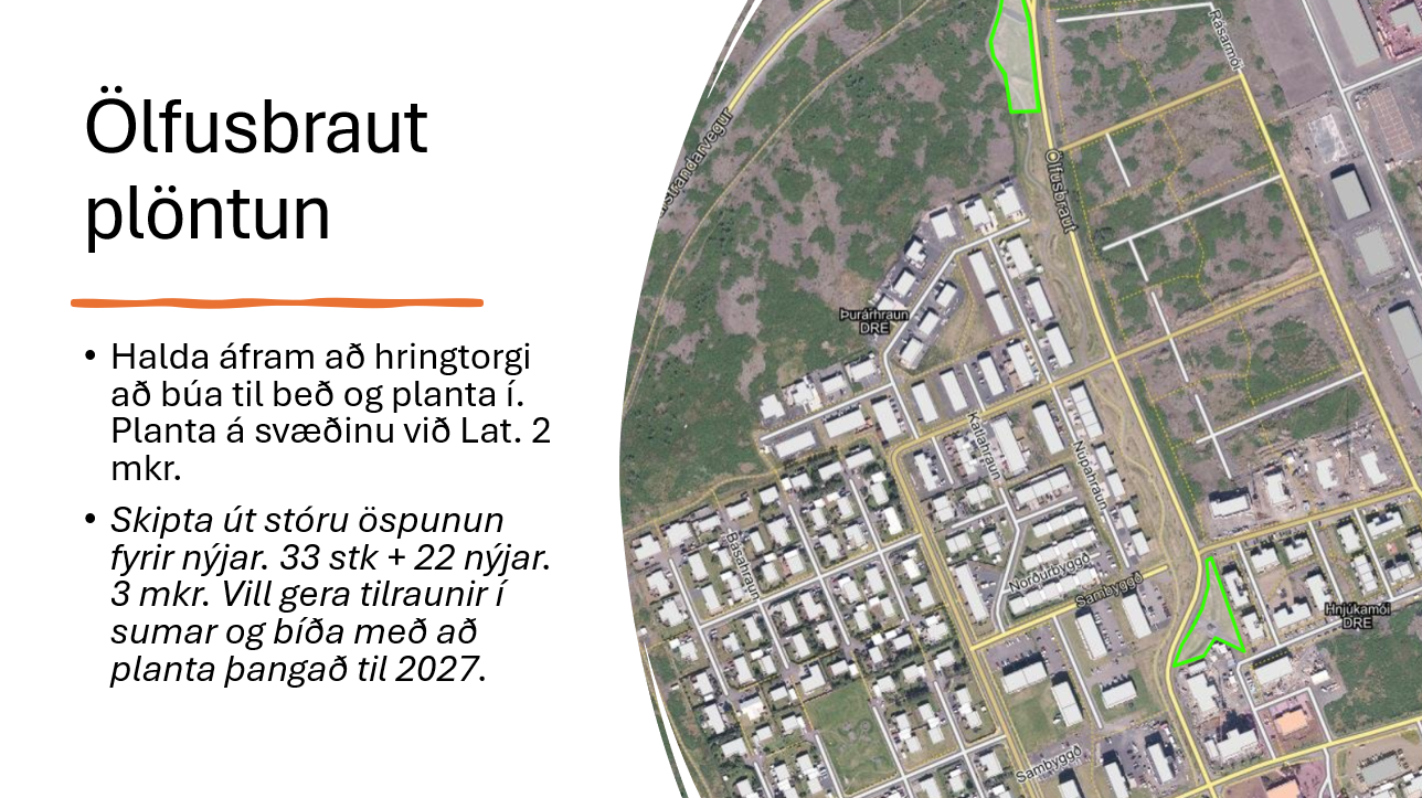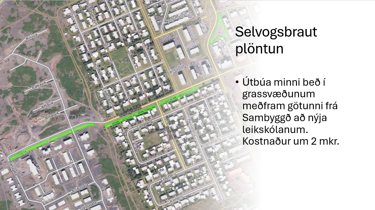 Á síðasta fundi framkvæmda- og hafnarráðs var kynnt niðurstaða starfshóps um áhersluatriði vorsins hvað opin svæði varðar. Þar er teiknuð upp skýr mynd af því hvernig áfram verður haldið að efla ásýnd bæjarins með markvissum hætti: gróðursetningu, sáningu og úrbótum sem gera nærumhverfi okkar hlýlegra, fallegra og manneskjulegra.