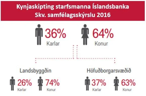 Það sem þó vekur sérstaka athyli mína við þetta er sú staðreynd að samkvæmt Samfélagsskýrslu Íslandsbanka frá árinu 2016 voru konur 64% af starfsmönnum Íslandsbanka. Á landsbyggðinni voru konur 74% af starfmönnum bankans. Nýrri samfélagsskýrslu fann ég ekki á netinu en hlýt að trúa því að bankinn minn hafi sjálfur tryggt jafnt kynjahlufall áður en hann ræðst gegn ójöfnu kynjahlutfalli fjölmiðla.