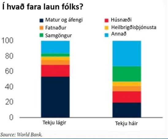 Samkvæmt tölum frá Alþjóðabankanum er staðreyndin sú að lægsta tekjutíundin notar rúmlega 50% af launum sínum í mat og áfengi (ath. áfengi er flokkað með matvælum í samantekt Alþjóða bankans) en tekjuháir nota eingöngu um 16% af sínum launum.