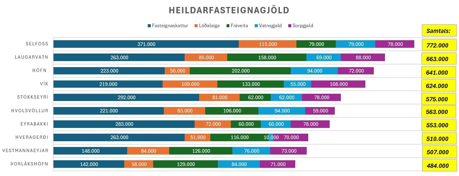 Það er áhugavert að bera fasteignagjöld í Þorlákshöfn saman við nokkra aðra þéttbýlisstaði á Suðurlandi, ekki hvað síst þegar horft er til allra þeirra gjalda sem mynda heildarfasteignagjöld. Þegar það er gert kemur í ljós að heildarfasteignagjöld í Þorlákshöfn eru þau lægstu þessara sveitarfélaga. (Reyndar held ég að sambærileg staða sé á Hellu en ég hafði þau gögn ekki við höndina.)