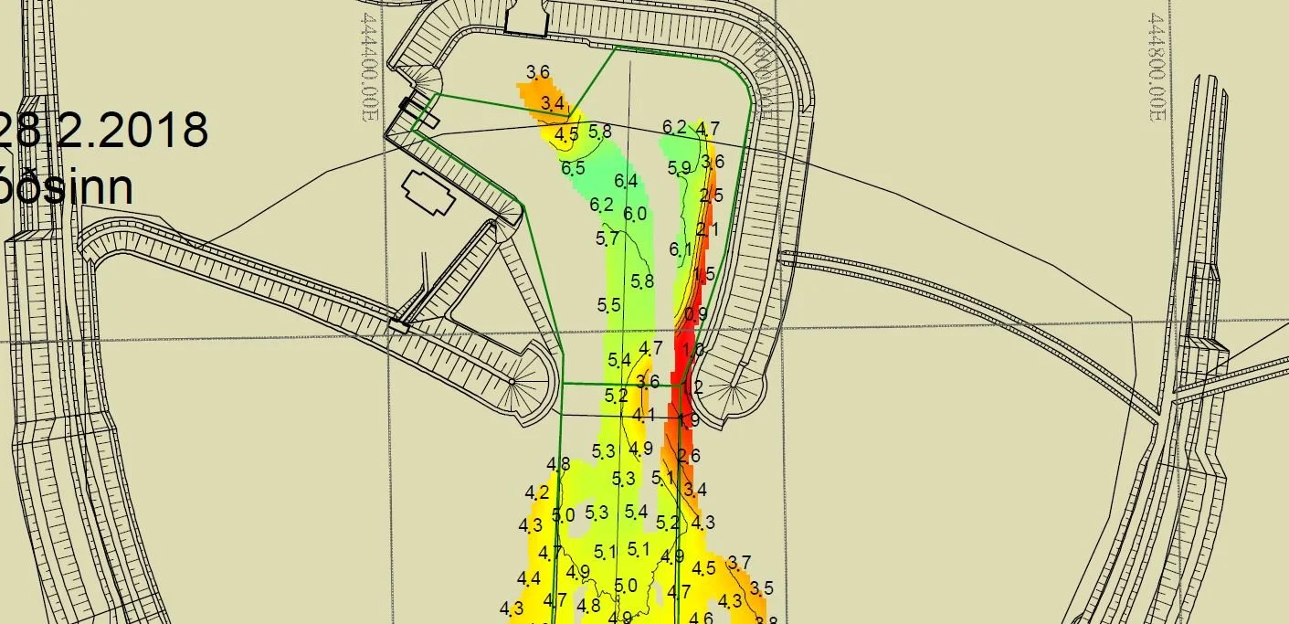 Án þess að ég sé einhver sérfræðingur í því að lesa úr svona mælingum þá þætti mér ekki ólíklegt að fjarlægja þurfi um 25.000 rúmmetra á milli garða og ef til vill eitthvað svipað á rifinu til að hægt sé að hefja siglingar, þótt slíkt væri þá háð sjávarstöðu.