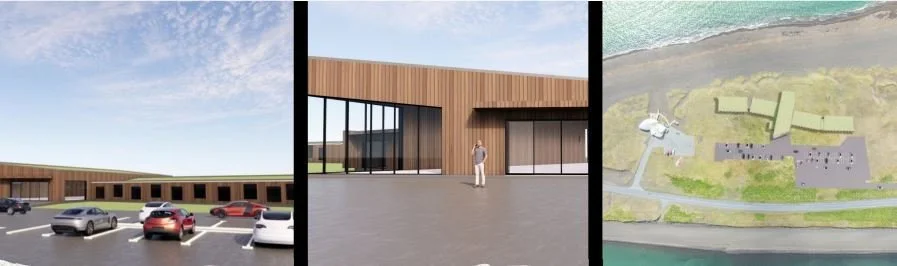 Ánægjulegt er að sjá þann ríka metnað sem lagður er í hönnun hússins. Áhersla er á notkun náttúrulegra byggingaefna svo sem lerkisklæðningu á útveggi sem mun grána og fá náttúrulegt útlit sem verður í takt við strandumhverfið sem húsið stendur í. Til að láta húsið falla enn frekar inn í umhverfið verður gras á þakinu.