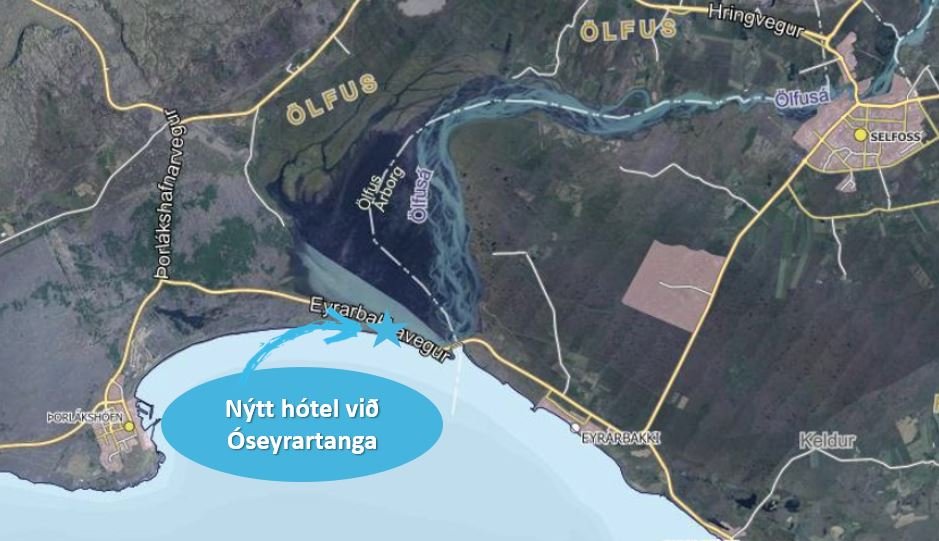 Núna í vikunni hófust framkvæmdir við nýtt hótel í Ölfusi. Um er að ræða 72herbergja lágreist hótel við Óseyrartanga, vestan Óseyrarbrúnna og veitingastaðinn Hafið bláa.