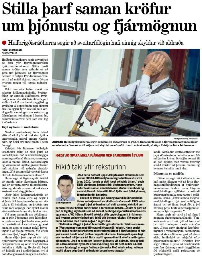 Nokkur sveitarfélög hafa óskað eftir að ríkið yfirtaki rekstur hjúkrunarheimila, meðal annars Garðabær, og fleiri eru með málin í þeim farvegi. Kristján Þór Júlíusson heilbrigðisráðherra telur að ekki þurfi að koma til þess. Það sé verkefni beggja samningsaðila að finna skynsamlega lausn á málinu. Ríkið, sveitarfélögin og viðkomandi sjálfseignarstofnanir hafi skyldur við aldraða einstaklinga. „Við getum ekki verið að kasta öldruðu fólki svona á milli okkar.“ Hann segir að lögin skyldi ríkið til að standa undir ákveðnum þáttum, það er að veita styrki til stofnkostnaðar og standa straum af rekstrarkostnaði með daggjöldum. „Stór hluti hjúkrunarheimila er rekinn með halla, eins og segir í skýrslu Ríkisendurskoðunar um úttekt á 43 heimilum, en þrettán eru rekin með afgangi. Þar sýnist manni það stærð heimilanna skipti ekki máli. Við erum sammála um að þjónustan er góð.