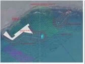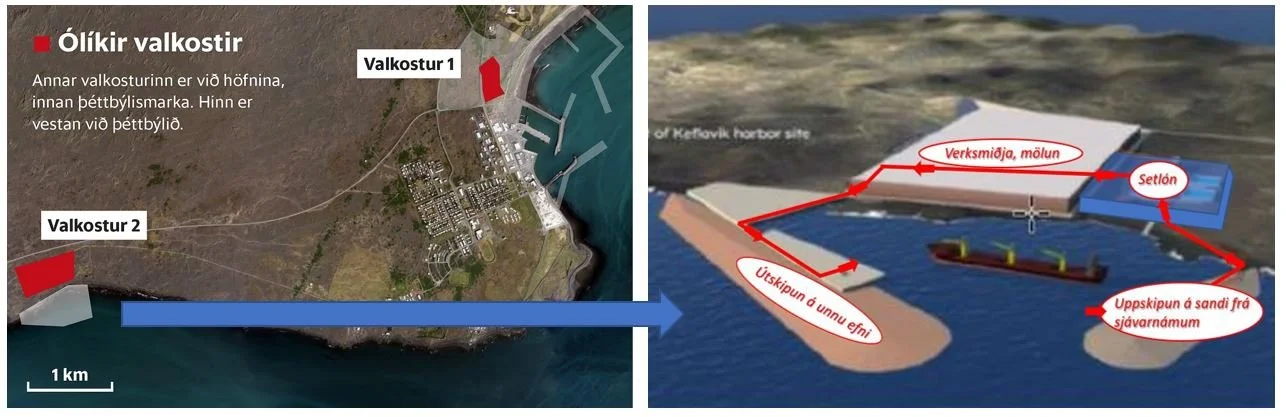 Myndin sýnir hvernig höfnin er nú hugsun um 5 km. vestar og hvernig fyrirkomulag er hugsað innan hafnarinnar.