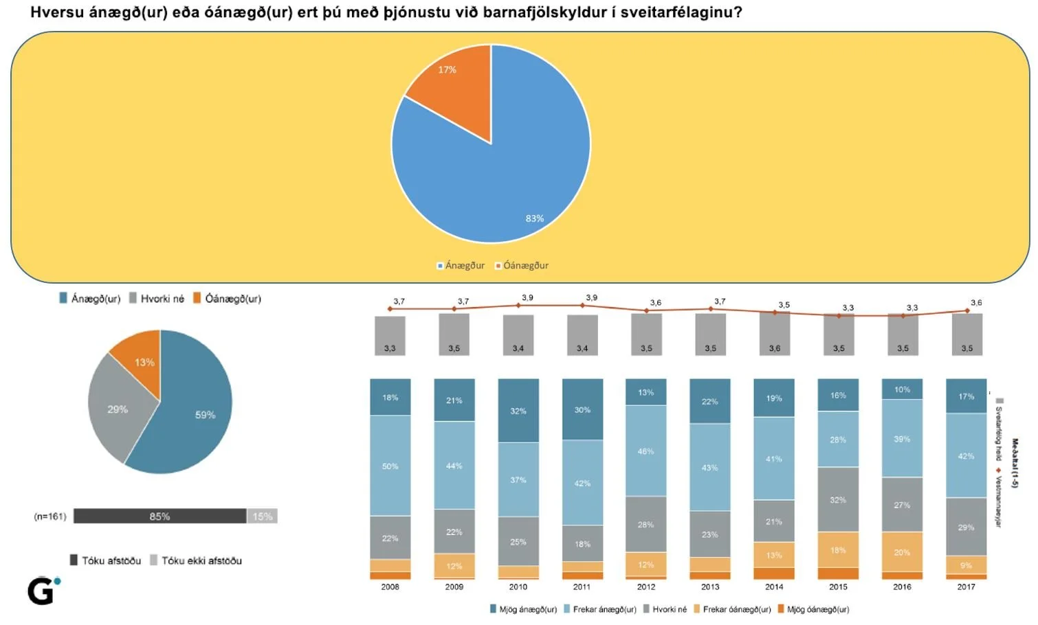 Þegar spurt var hversu ánægðir íbúar væru með þjónustu við barnafjölskyldur í sveitarfélaginu kom í ljós að af þeim sem tóku afstöðu (87%) sögðust 83% ánægð en 17% óánægð og eykst ánægjan á milli ára og er yfir landsmeðaltali.