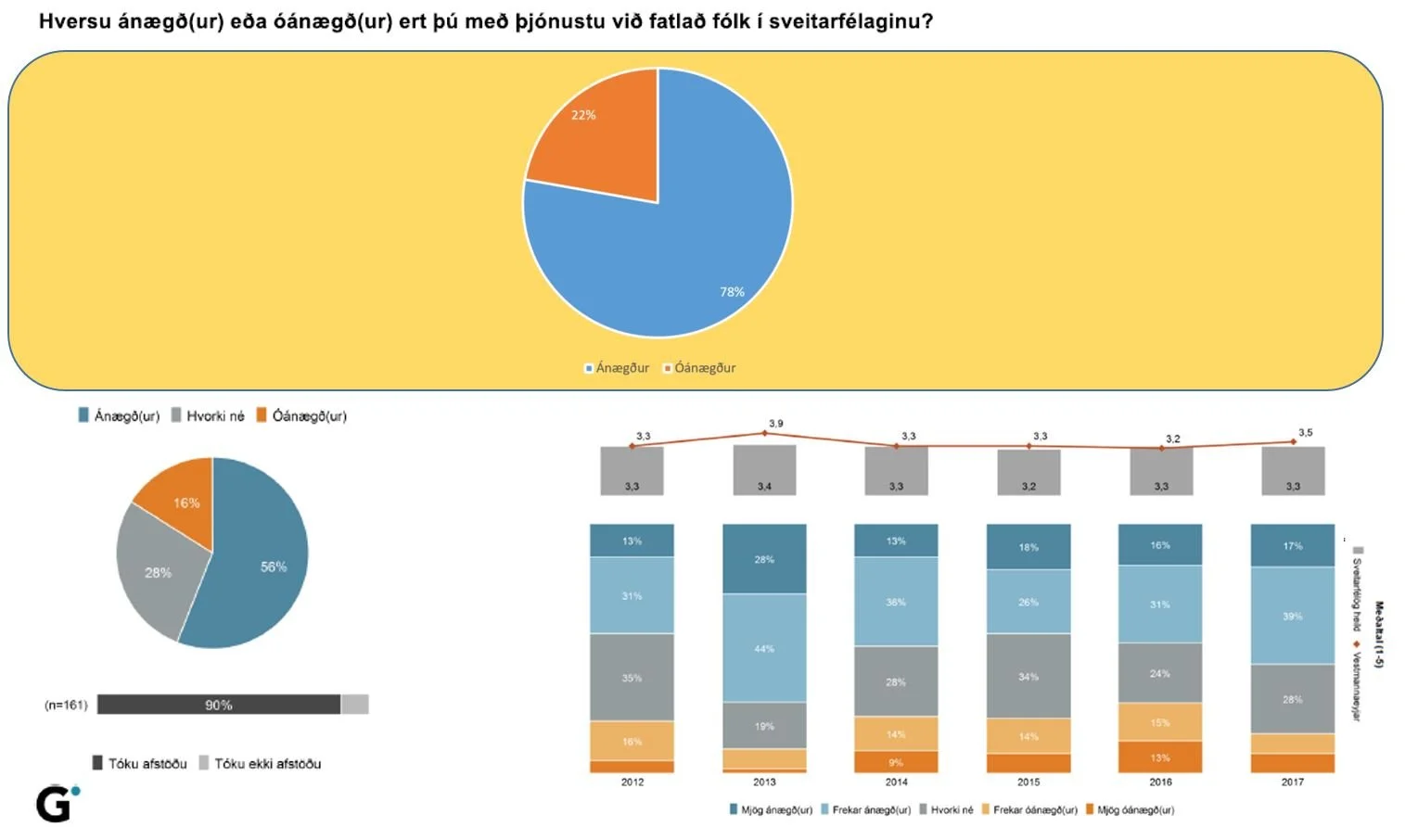 Þegar spurt var hversu ánægðir íbúar væru með þjónustu við fatlað fólk í sveitarfélaginu kom í ljós að af þeim sem afstöðu tóku (72%) sögðust 78% vera ánægð en 22% óánægð og eykst ánægjan á milli ára og er yfir landsmeðaltali.