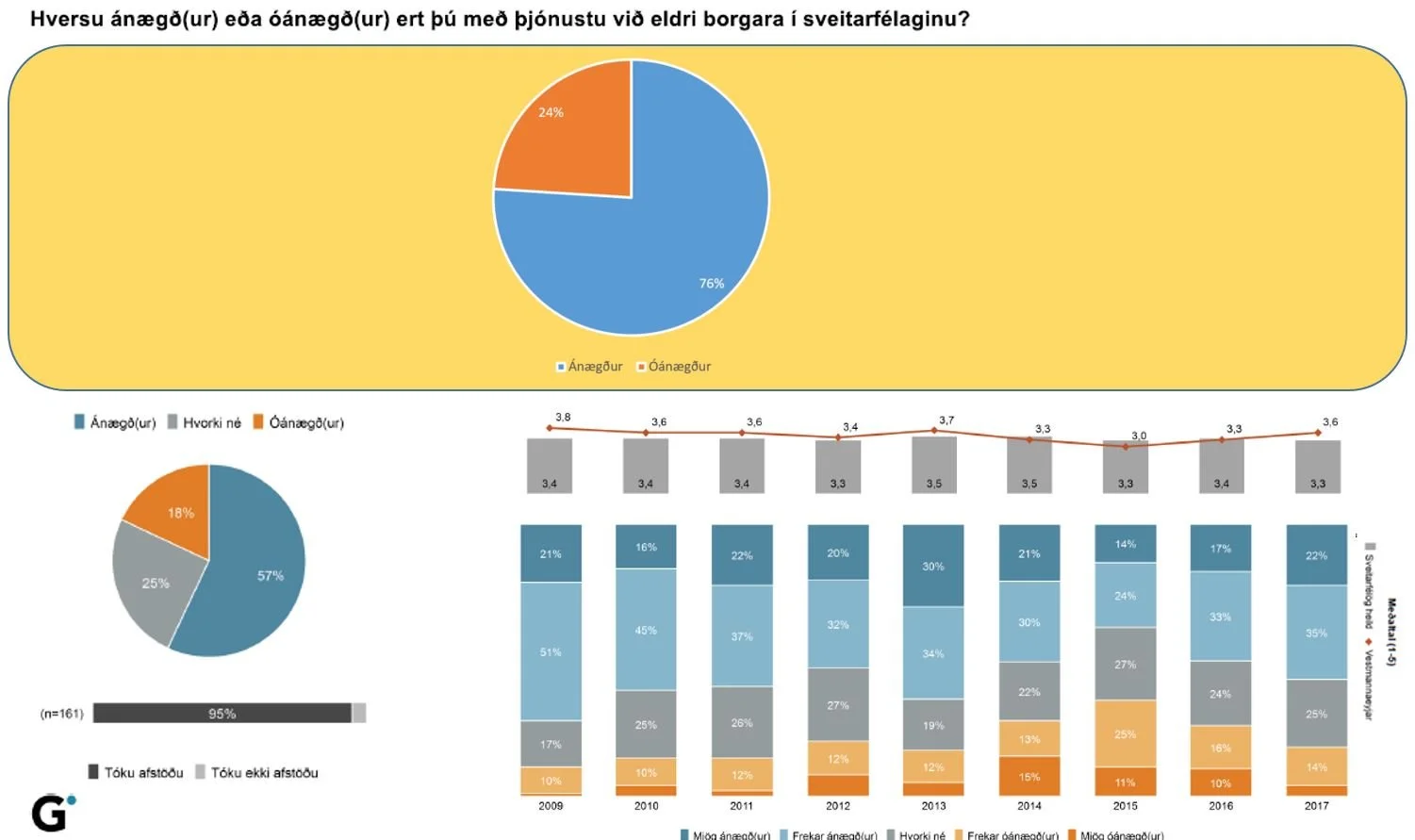 Þá var spurt hversu ánægðir íbúar væru með þjónustu við eldri borgara í sveitarfélaginu kom í ljós að af þeim sem afstöðu tóku (75%) sögðust 76% vera ánægð en 24% óánægð og eykst ánægjan verulega á milli ára og er nokkuð hátt yfir landsmeðaltali.