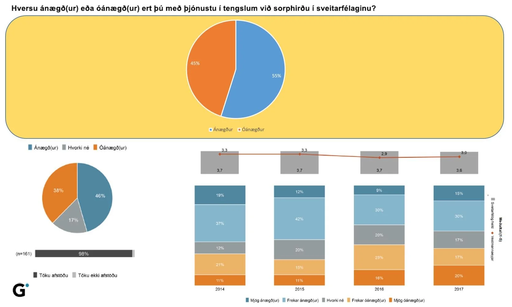 Eingöngu var spurt út í einn lið er snýr að þjónustu ráðsins og sneri hann að sorphirðu. Þegar spurt var hversu ánægðir íbúar væru með þjónustu í tengslum við sorphirðu í sveitarfélaginu kom í ljós að af þeim sem tóku afstöðu (84%) voru eingöngu 55% ánægð en 45% óánægð. Meðaleinkunn sveitarfélaga á þessari spurningu á skalanum 1 til 5 var 3,6 en einkunn Vestmannaeyjabæjar einungis 3 og því langt undir meðaltali.