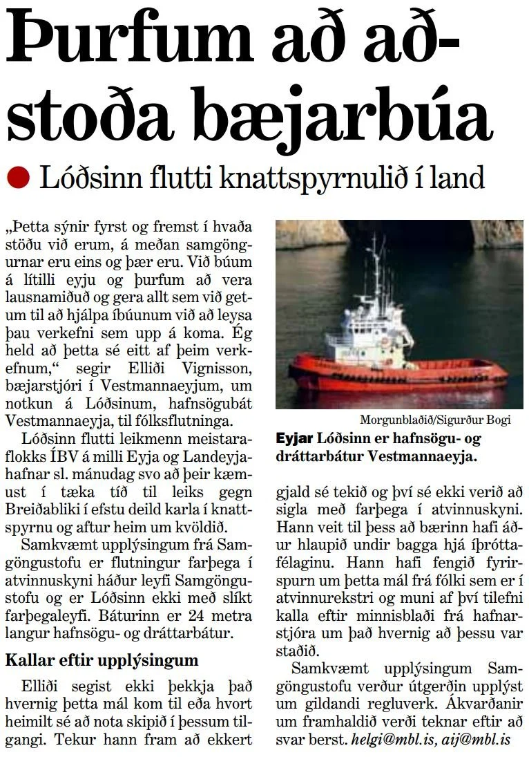 Í Morgunblaðinu í dag er viðtal við mig um ákvörðun okkar að nota í undantekningatilvikum Lóðs- og björgunarbát Vestmannaeyjahafnar til að hlaupa undir bagga með bæjarbúum sem eru í vanda vegna stöðu mála í samgöngum.