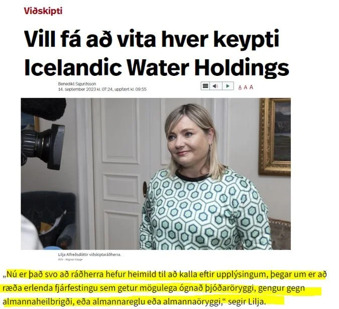 Ætli ábúendum að Hlíðarenda í Ölfusi hafi einhvern tíman dottið í hug að ráðherra í ríkisstjórn myndi telja bæjarlækinn þeirra varða þjóðaröryggi? Sú er nú samt staðan núna. Lilja Alfreðsdóttir, viðskiptaráðherra, geysist nú fram og ræðir kaup og sölu á hlutabréfum í fyrirtæki sem setur vatn á flöskur. Hún telur að það sé möguleg ógn við þjóðaröryggi. (Vill fá að vita hver keypti Icelandic Water Holdings - RÚV.is (ruv.is)).